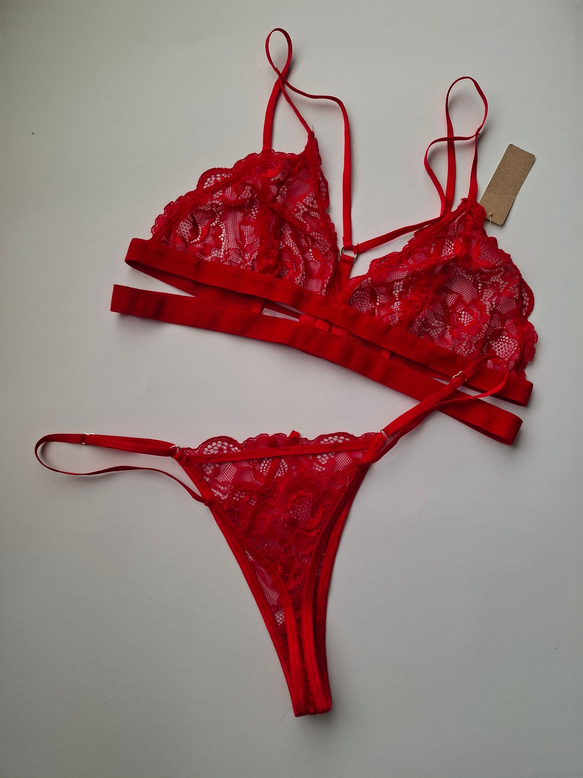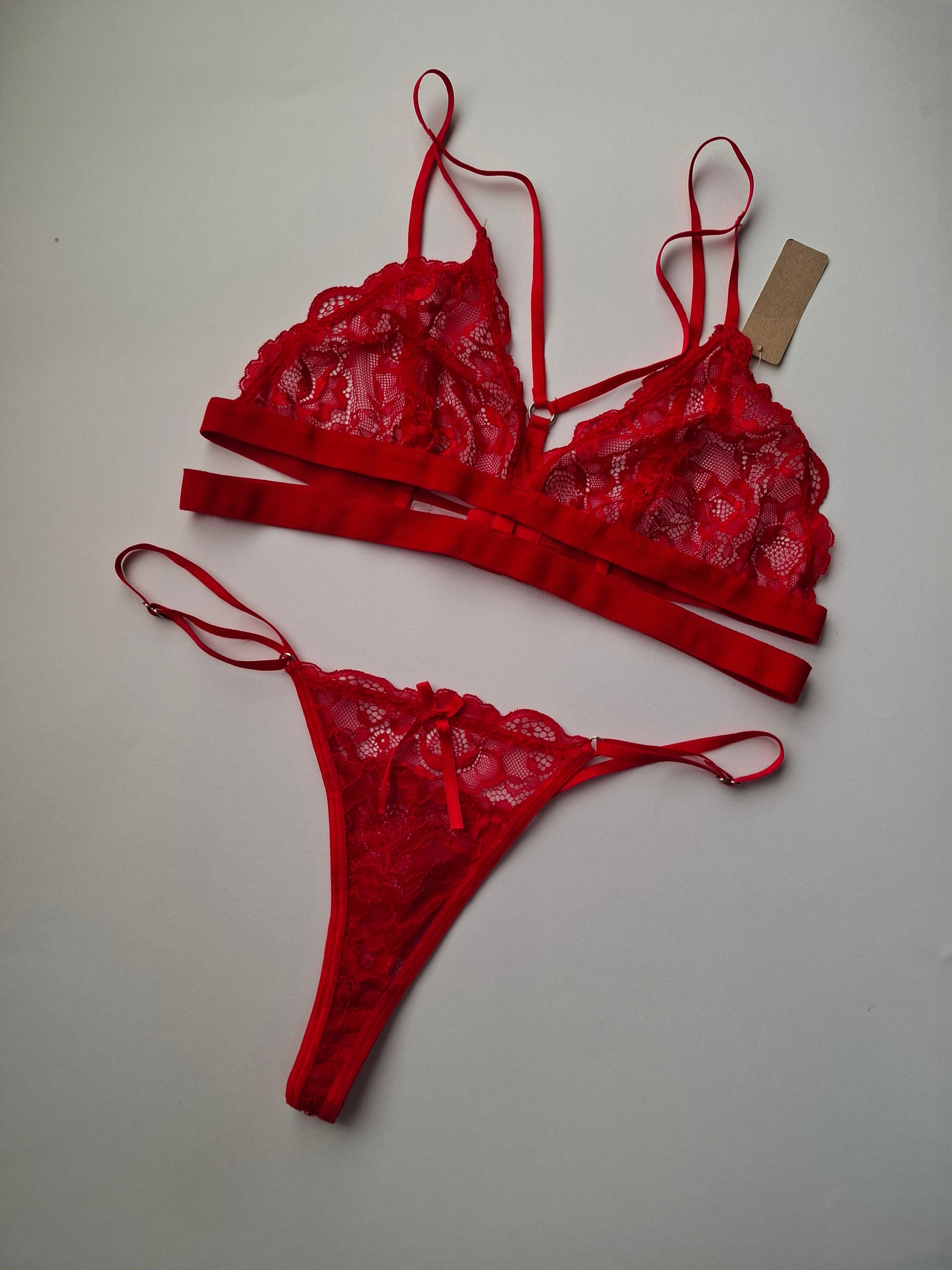 Conjunto triangulo de puntilla con detalle de tiras y less regulable.