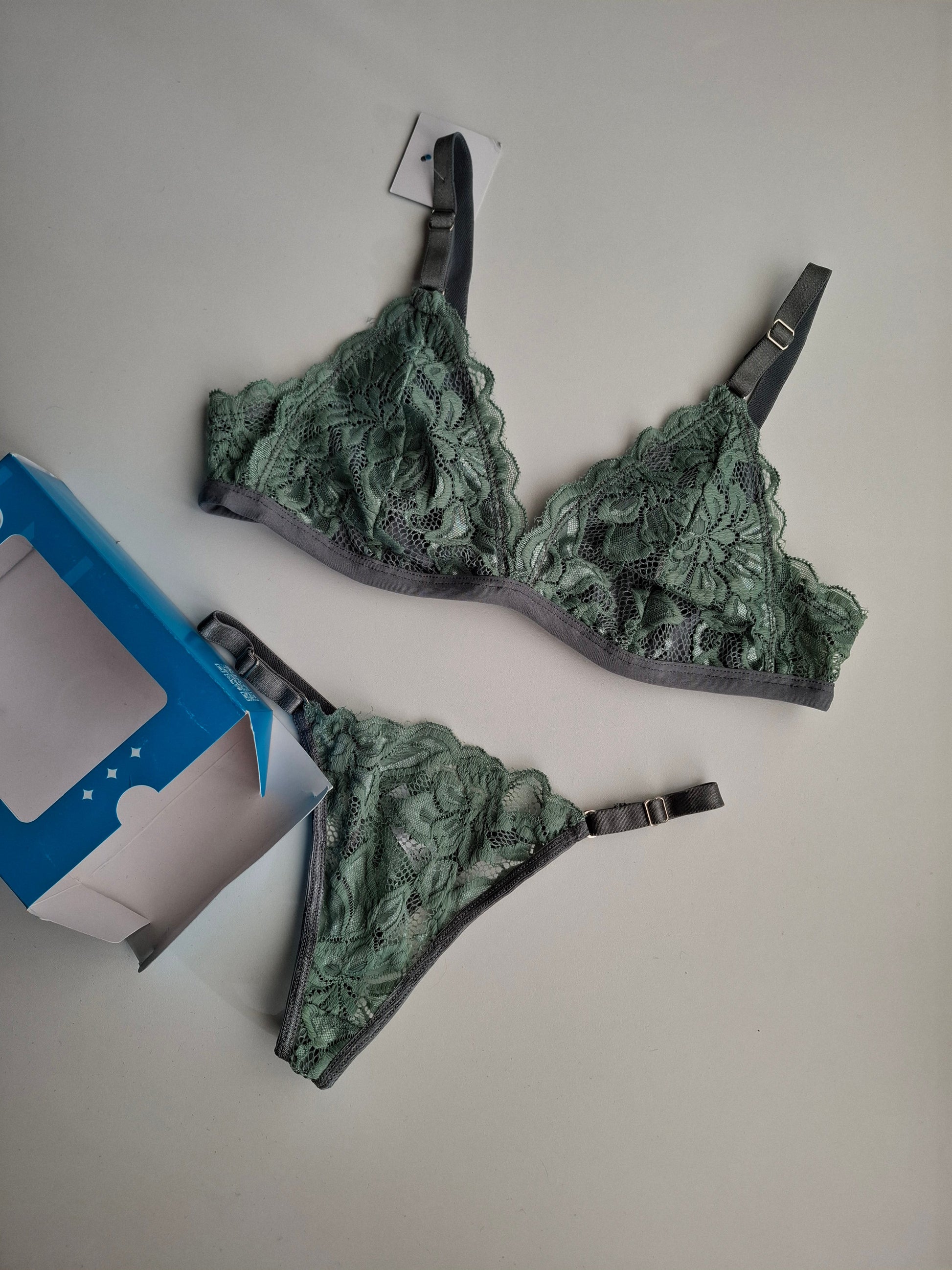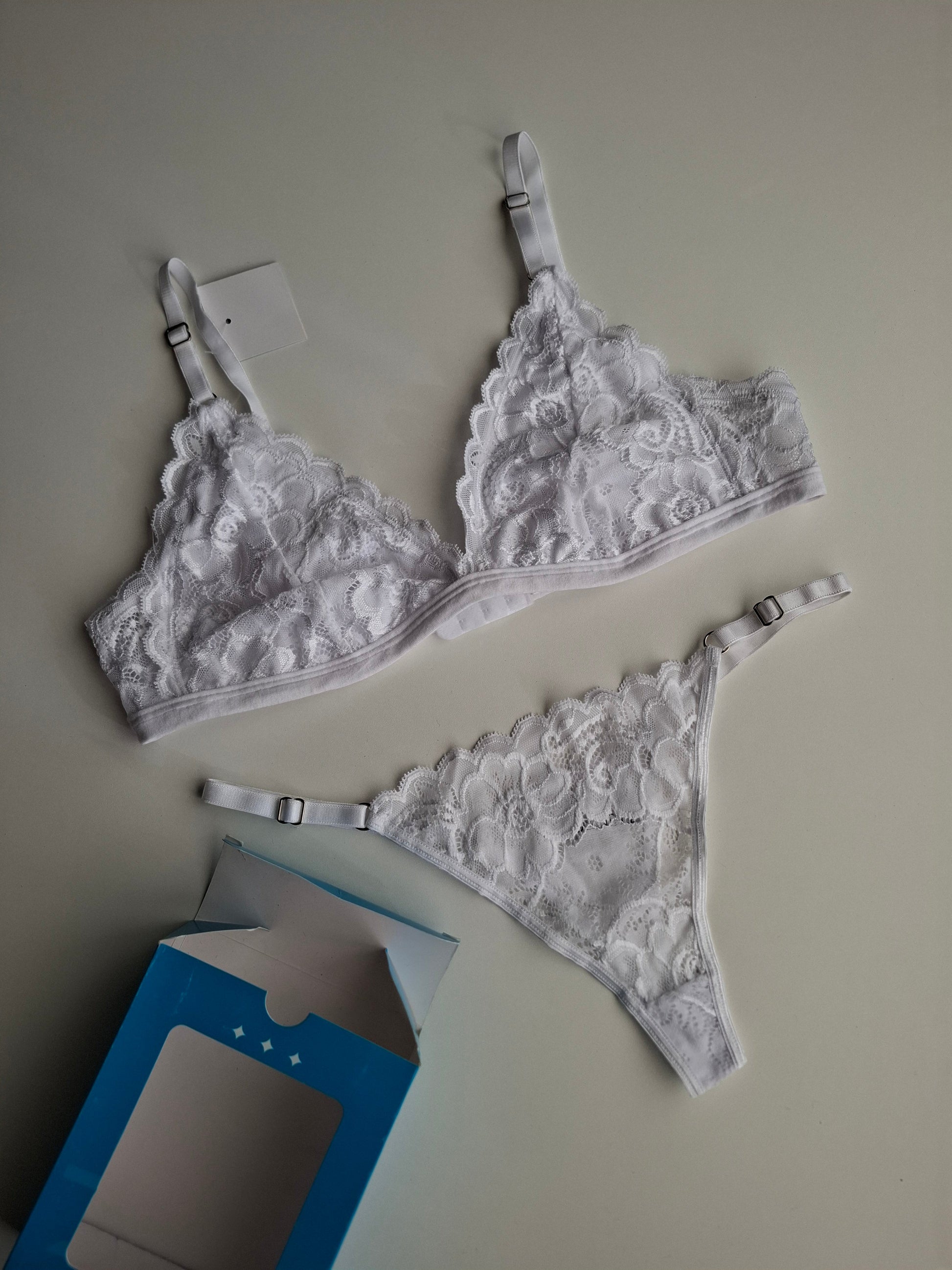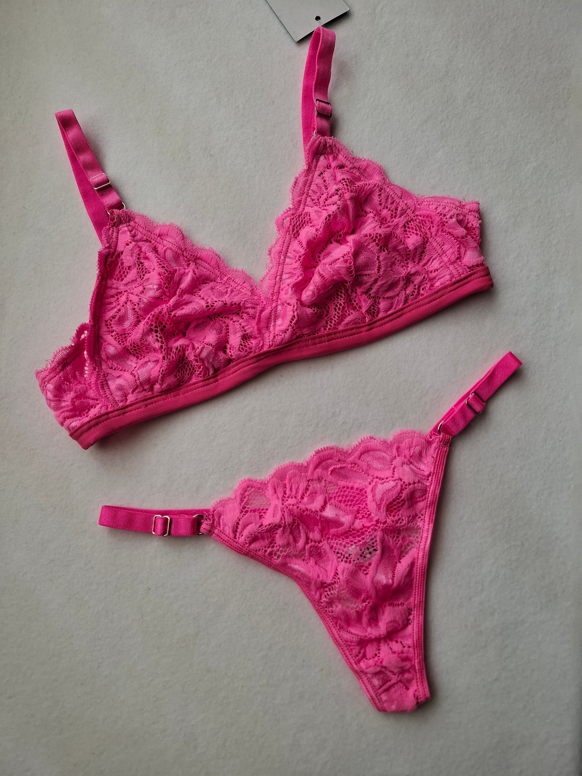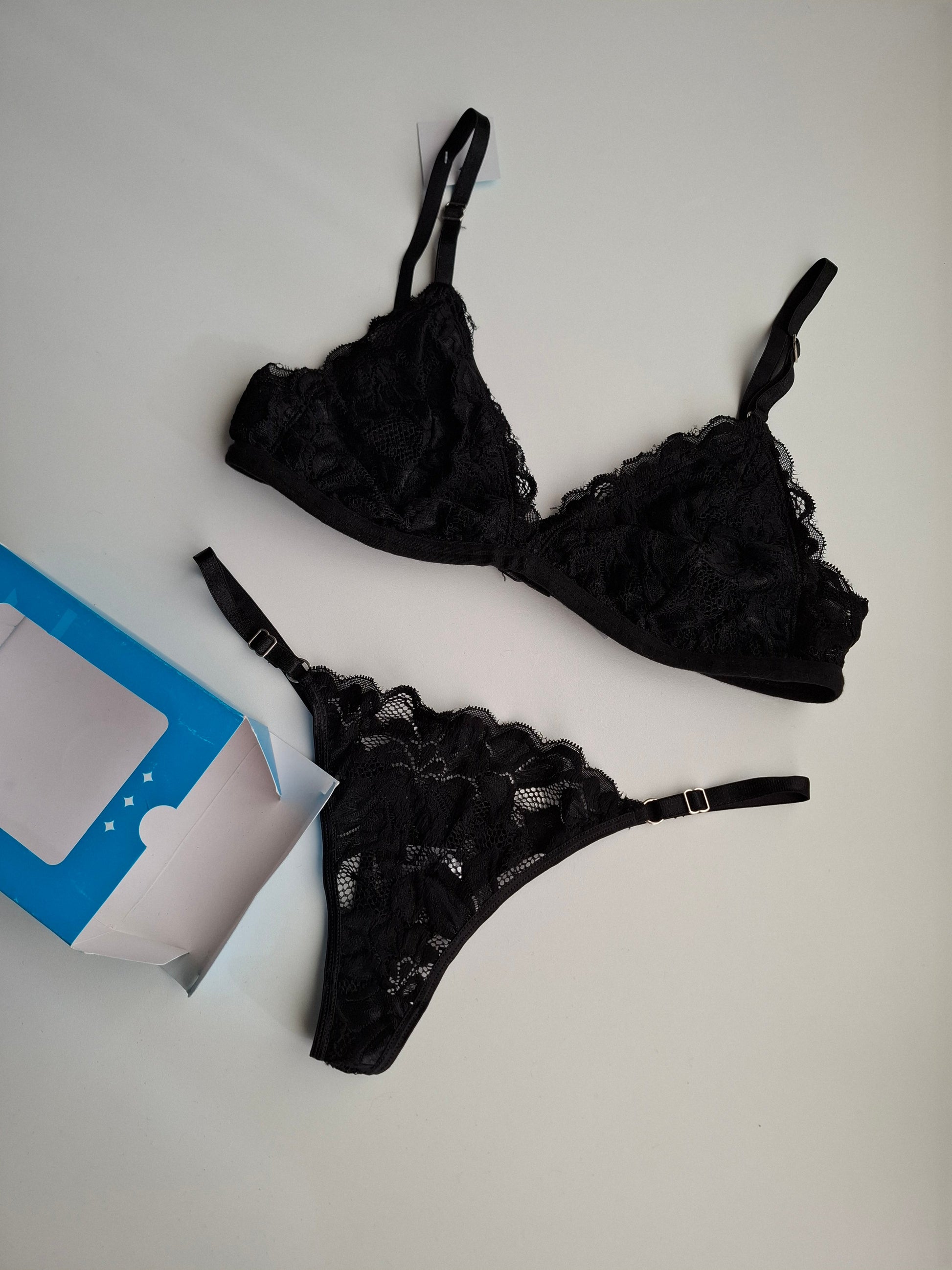 Conjunto bralette forrado, tiene arandelas de metal con baño hipoalargenico. Junto con su tangaless regulable de puntilla elastica.