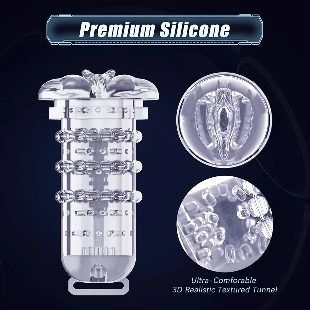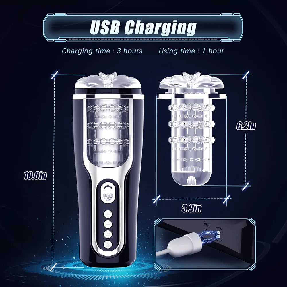 Equipado con 10 modos de empuje y vibración, ofrece una estimulación intensa y totalmente personalizada. Su manga interna texturizada de TPE con protuberancias y ranuras, junto con su forma ergonómica y agarre firme, garantiza una experiencia única en cada uso.