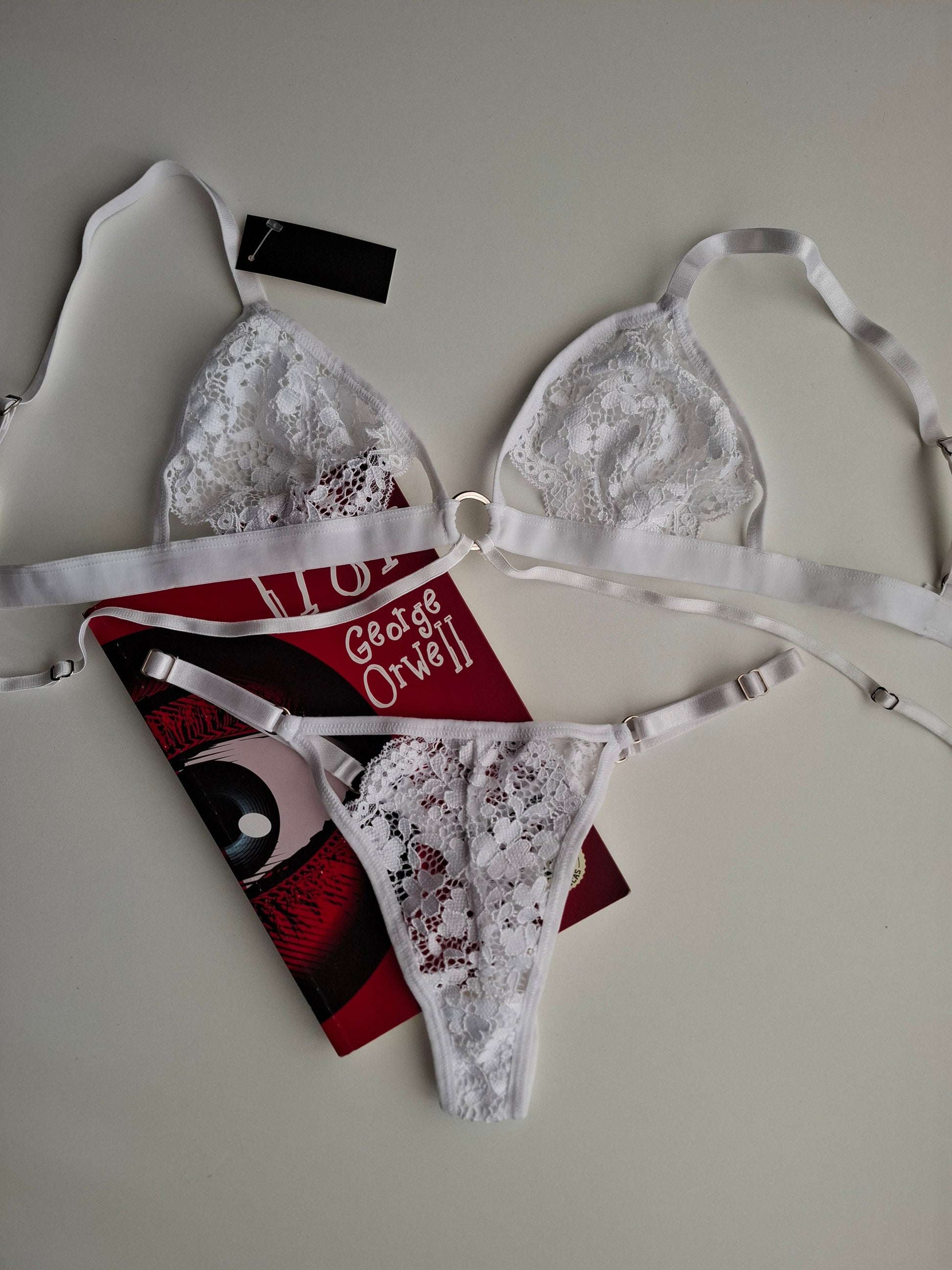 BRALETTE DE PUNTILLA, TAZA TRIÁNGULO SIN ARMAR, CON DETALLE DE VACÍOS EN TAZAS, ARGOLLA EN EL CENTRO, Y BRETEL EN CINTURA QUE SE REGULA Y ABROCHA EN ESPALDA.