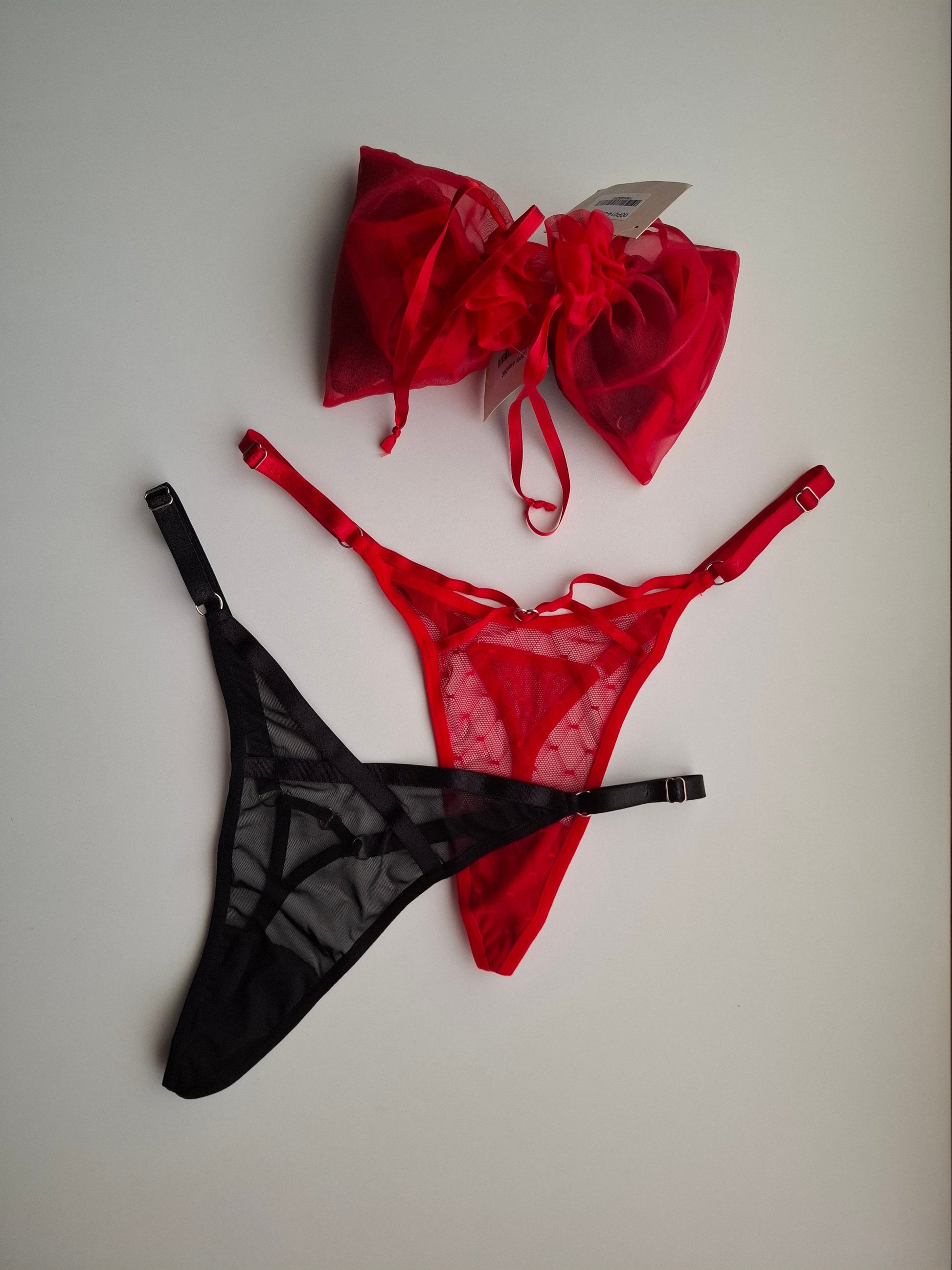 Pack x 2 less regulables. Una roja de tul plumetí con breteles entrecruzados en el centro con accesorio de corazón, y una negra de tul c/Lycra con detalle de bretel y cola libre con accesorio de corazón.