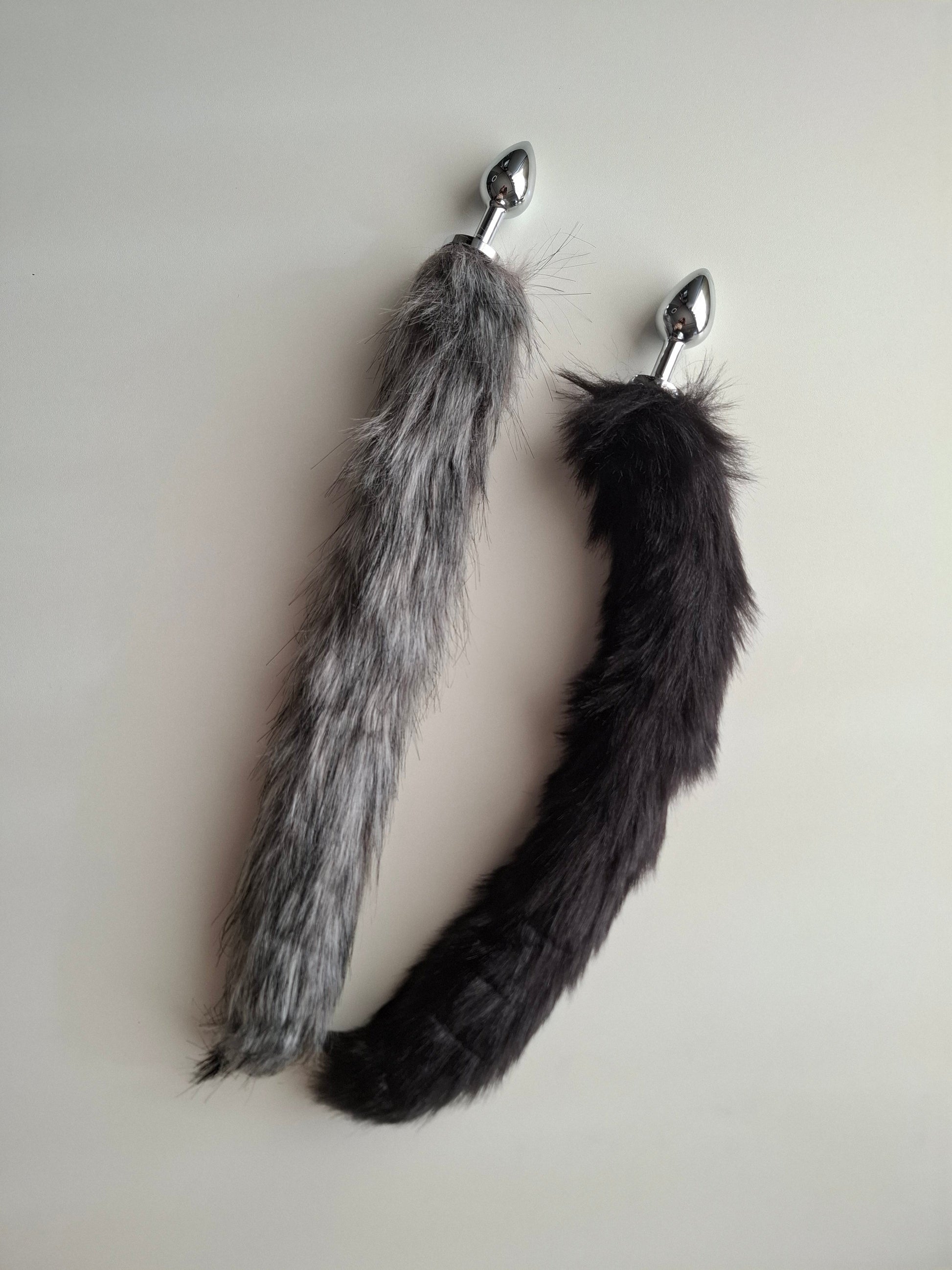 Plug metálico liso, firme y de superficie fría. Cola de zorro sintética, suave al tacto y de aspecto realista.