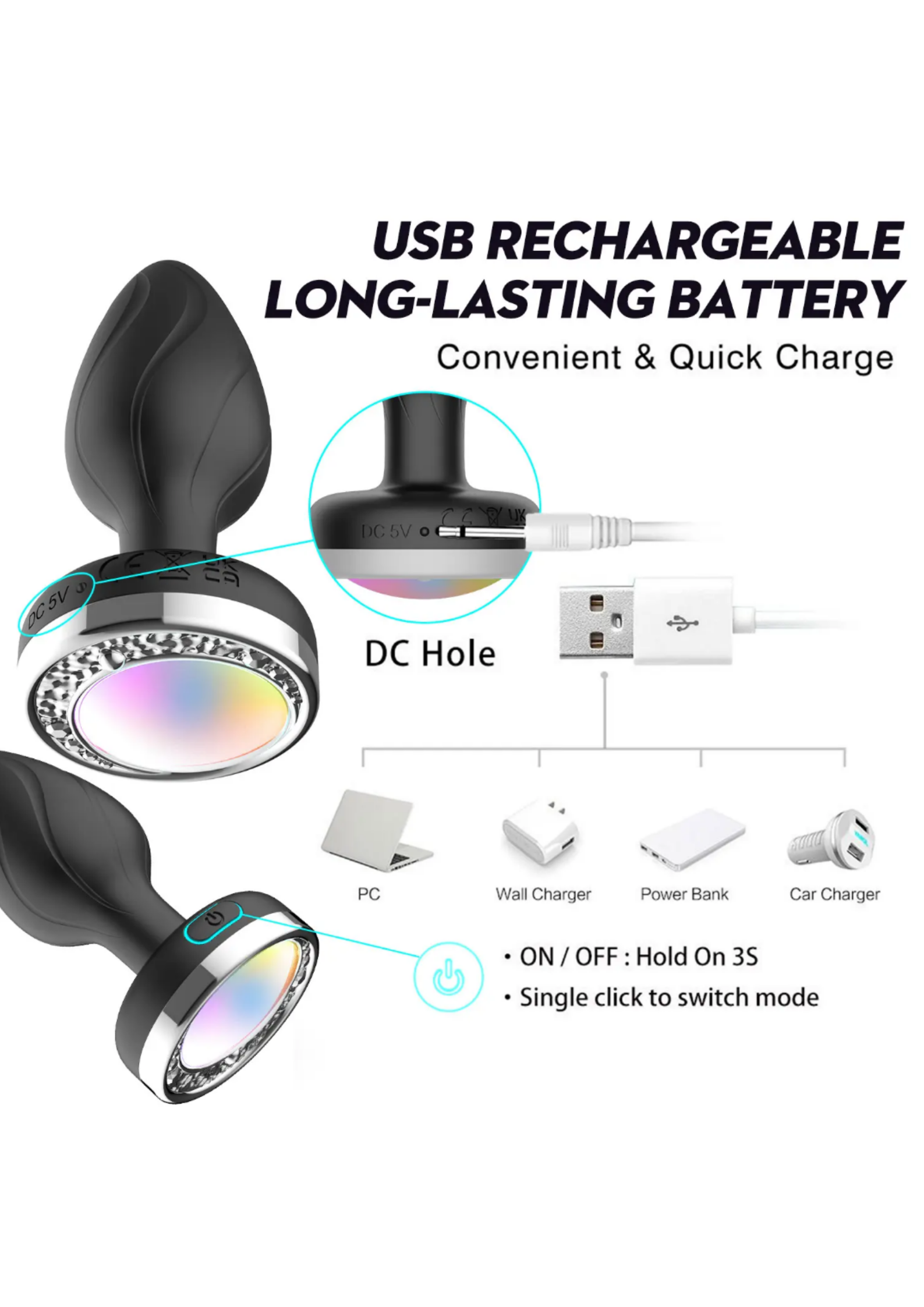 Este plug anal combina diseño elegante, vibraciones personalizables y luces LED multicolores para una experiencia sensorial única. Ideal para juegos en solitario o en pareja, incluso a distancia.